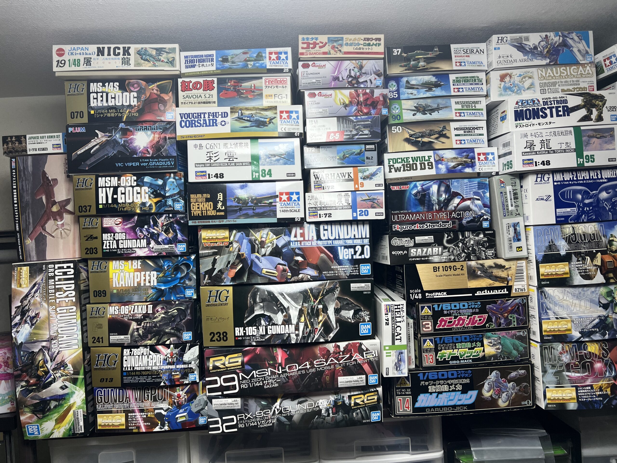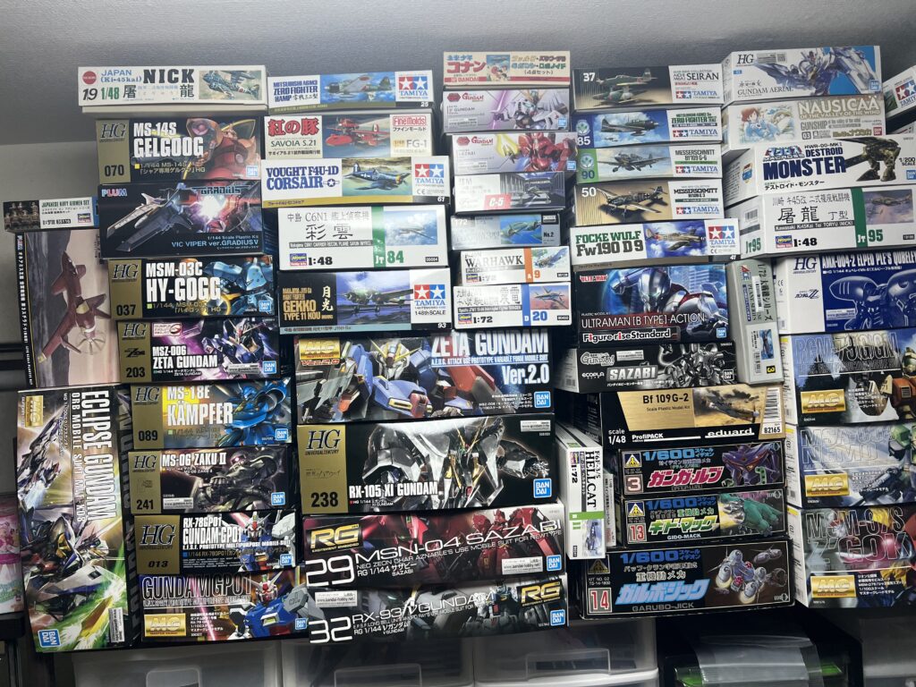 それらの棚の向いに設置したスチール製のラックには、ついつい買い集めてしまったプラモデルのキットが積みあがっている、いわゆる「積みプラ≒罪プラ」というヤツだ、どこの家庭でもあるアレだ、その内訳は半数がガンダム系、半数が戦闘機などもスケールモデルというヤツだ。